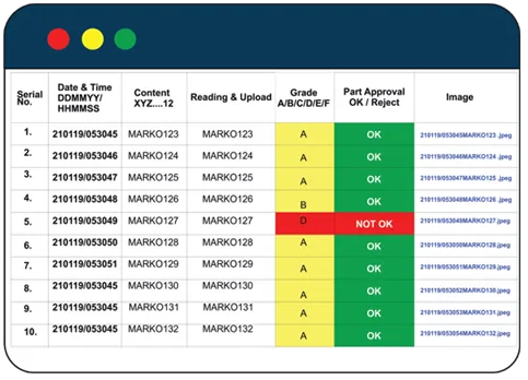Production log helps in identifying the component and trace data, the grade of 2D data, rejected part in the production process and uploaded images of the 2D code. Built in analytical tools for quick tools for quick analysis